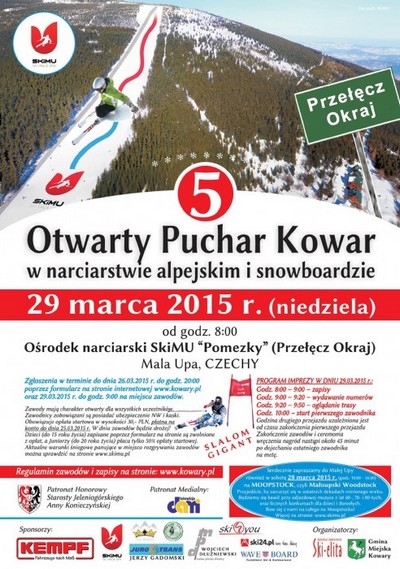 29 marca 2015 r. (niedziela) w Ośrodku narciarskim SkiMU "Pomezky" (Przełęcz Okraj), Mala Upa (Czechy) odbędą się zawody sportowe pn. "V. Otwarty Puchar Kowar w narciarstwie alpejskim i snowboardzie".