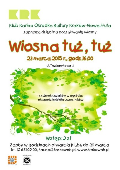 Wiosna tuż, tuż. Klub Karino Ośrodka Kultury Kraków-Nowa Huta (ul. Truskawkowa 4) zaprasza 23 marca 2015, o godz. 16.00 na poszukiwanie wiosny.