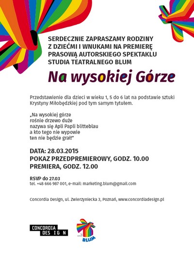 Teatr dla najmłodszych BLUM to pierwszy zawodowy teatr dla dzieci „naj-najmłodszych”. Profesjonalni aktorzy, przemyślana, interaktywna scenografia i specjalna metodologia zapoznawania dzieci z językiem i specyfiką teatru to tylko niektóre z zalet Bluma. Scena teatru dla małego widza znajduje się w centrum designu Concordia Design i to właśnie tam, już 28 marca, przy ulicy Zwierzynieckiej 3 w Poznaniu odbędzie się premiera najnowszego spektaklu „Na wysokiej górze” opartego na twórczości Krystyny Miłobędzkiej.