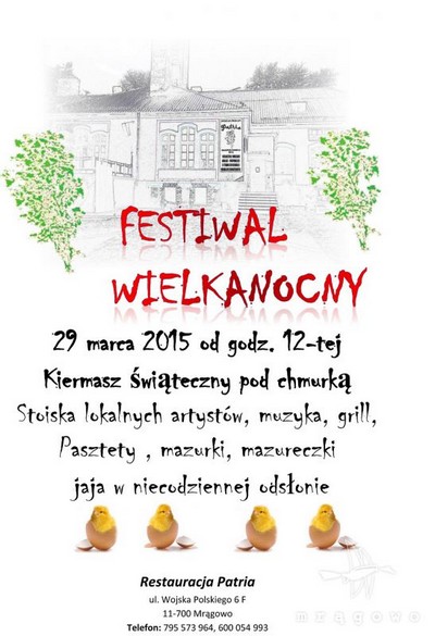 W najbliższą niedzielę, 29 marca przed Restauracją Patria w Mrągowie odbędzie się kiermasz wielkanocny połączony z piknikiem. Rozpoczęcie o godz. 12.00.