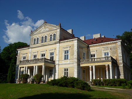Przed portykiem zdobiącym główne wejście do pałacu ustawione są dwa marmurowe lwy, podtrzymujące tarcze z herbami: Nałęcz (Przewiązka) - hrabiów Raczyńskich i Czetwertyński I (Święty Jerzy zabijający smoka) - książąt Czetwertyńskich. Były one na czas wojny zakopane w miejscu, w którym obecnie stoją. Podczas wojny hitlerowcy zajęli pałac i przenieśli Raczyńskich do dworku. W 1944 r. wysiedlili rodzinę właścicieli do Częstochowy, aby nie widzieli dokonywanej kradzieży. Najcenniejsze elementy wyposażenia pałacu Niemcy wywieźli w 1945 r. Resztę zniszczyli po wkroczeniu Rosjanie.