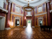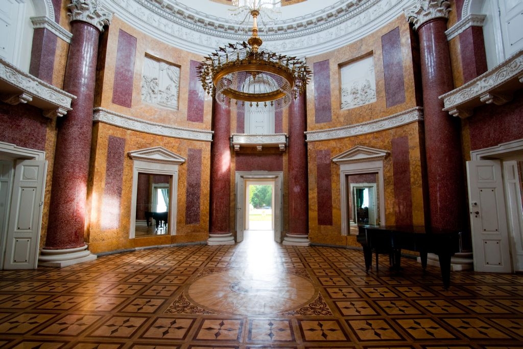 Posadzka sali rotundowej została misternie ułożona z różnokolorowego drewna w jej środkowym rondzie umieszczono wizerunek Orła i Pogoni. Prace malarskie powierzył hrabia Skórzewski profesorowi uniwersytetu wileńskiego Franciszkowi Smuglewiczowi i jego bratu Antoniemu - twórcom dekoracji Zamku Ujazdowskiego w Warszawie. Kopułę pałacu ozdobiła rzeźba Atlasa dźwigającego kulę ziemską - dzieło rzeźbiarza Władysława Marcinkowskiego.