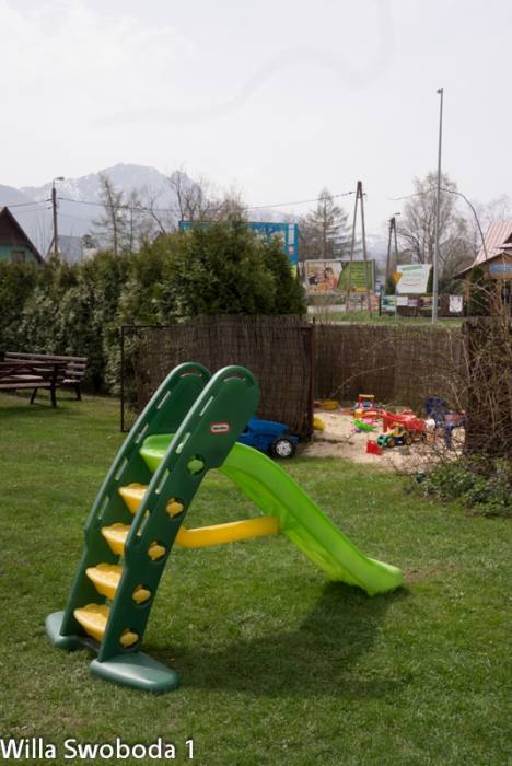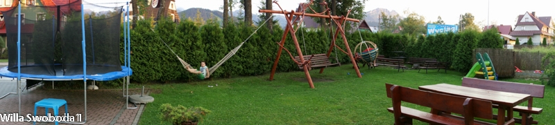 Obiekt oferuje pokoje z łazienką, tv i wifi. Bezpłanty parking, ping- pong. Naszym atutem jest duży ogród z placem zabaw dla dzieci (trampolina, piaskownica, zjeżdżalnia, huśtawki). Tutaj również znajduje się grill oraz miejsce do zapalenia ogniska. Z ogrodu widać piękną panoramę Tatr. 2,5km do Krupówek, 1km do szlaków, 600m do wyciągu narciarskiego.